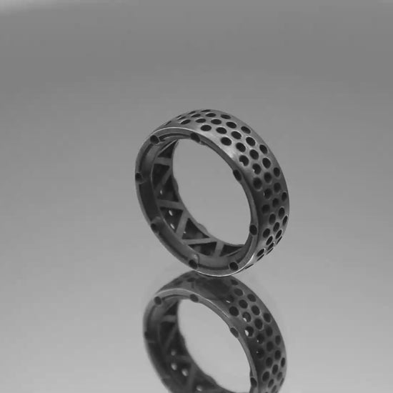 ★ Detailed Sophistication: The holed exterior of the Perforated Chassis ring, paired with the detailed industrial lattice below, expresses strength, purposefulness, and depth.