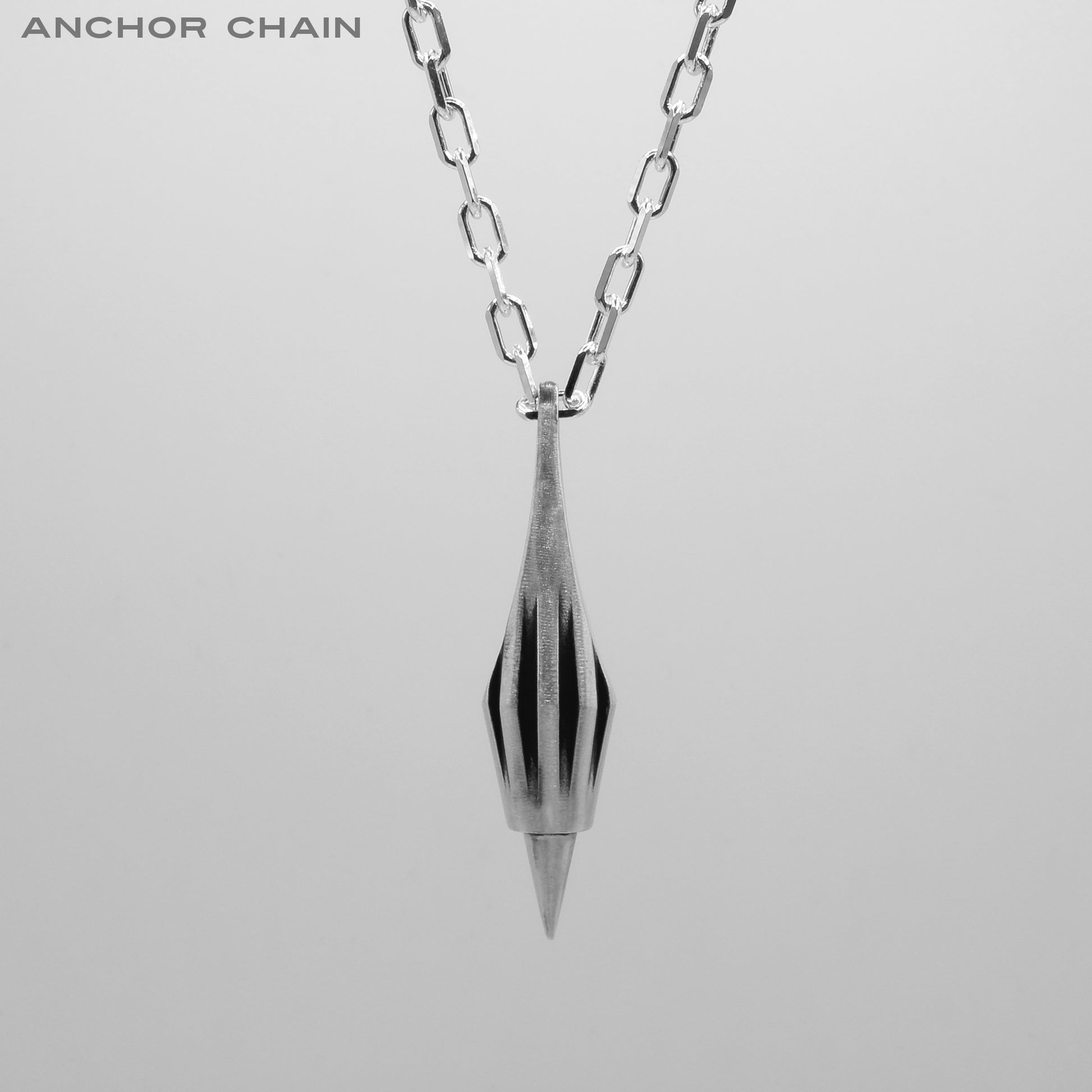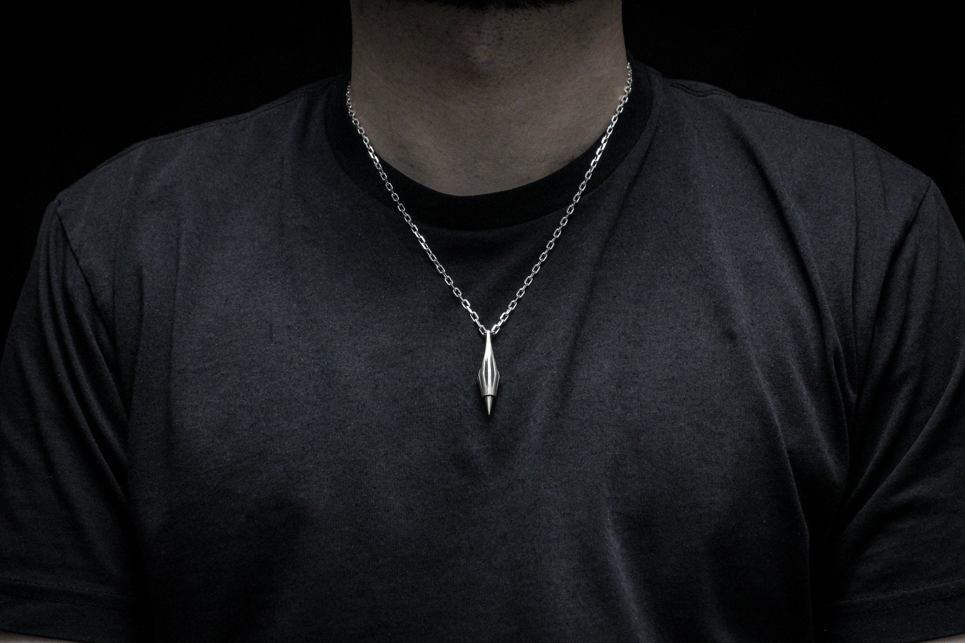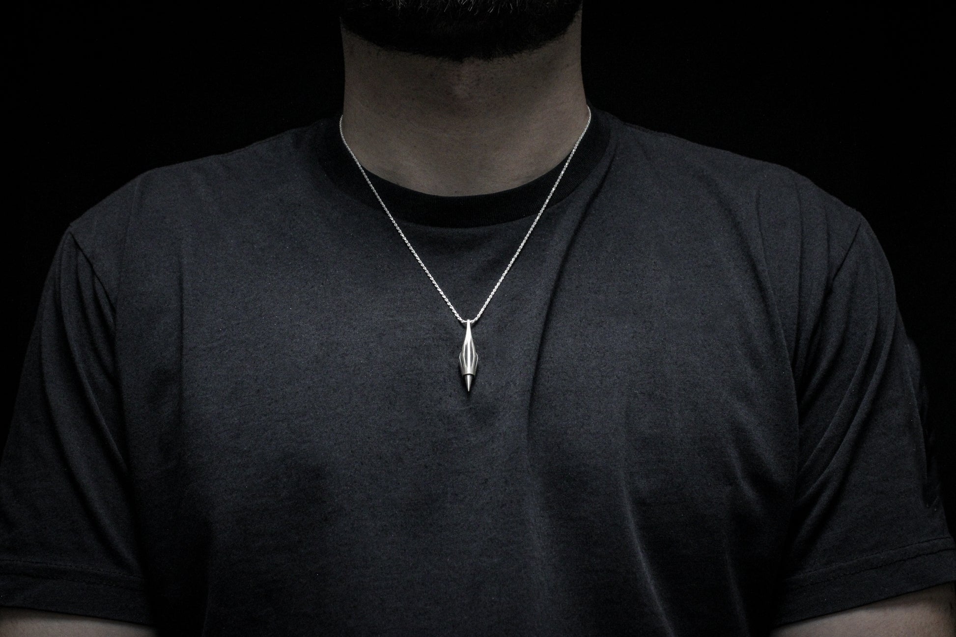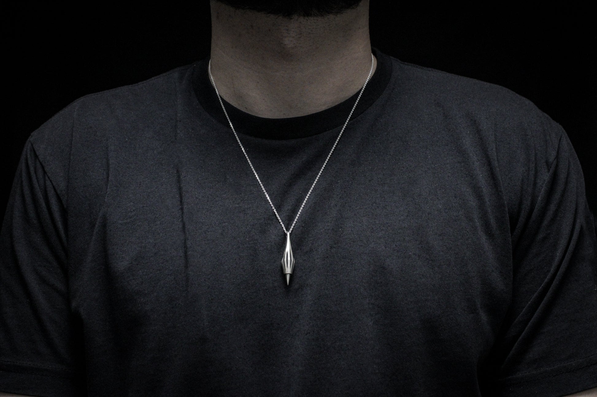 Pointed, charged, and refined, this design was birthed from the arrangement of three triangles. I wanted to take the design theory of big, medium, small, and arrange a form that subjectively communicated power, capability, and grit but was refined and graceful in execution. The outcome is the striking silhouette before you. Reminiscent of sabot bullets in both form and function, this pendant is to be worn by those that want to communicate the same characteristics in their personality.
